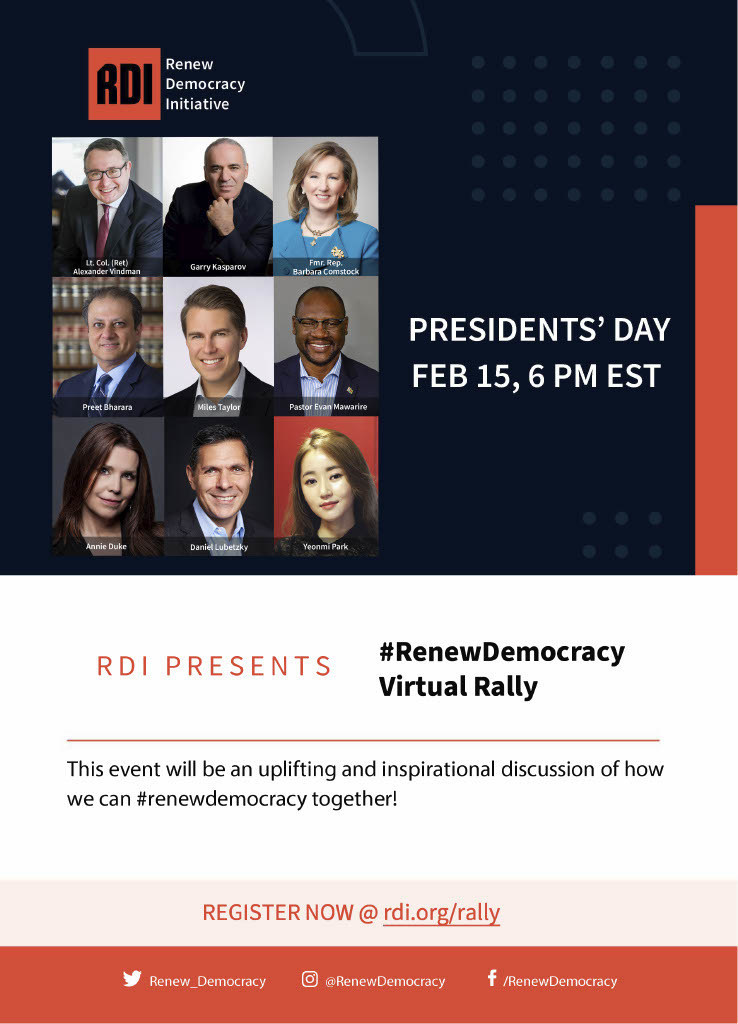 NEW YORK, Feb. 11, 2021 /PRNewswire/ — On February, 15th at 6 pm ET, the Renew Democracy Initiative is hosting a virtual pro-democracy rally with Lt. Col. (Ret.) Alexander Vindman, Garry Kasparov, Miles Taylor (NYT’s ‘Anonymous’), Zimbabwean pastor and democracy activist – Evan Mawarire, Fmr. Congresswoman Barbara Comstock, Kind Bar Founder – Daniel Lubetzky, World Poker Champion – Annie Duke, and others. This will be a positive, inspiring occasion as we celebrate the virtues of democracy and discuss how to move forward from the assault on democracy that occurred on January 6th. The event will be moderated by Uriel Epshtein (Executive Director RDI) and Daniel Miller (Director of Content & Strategy RDI).