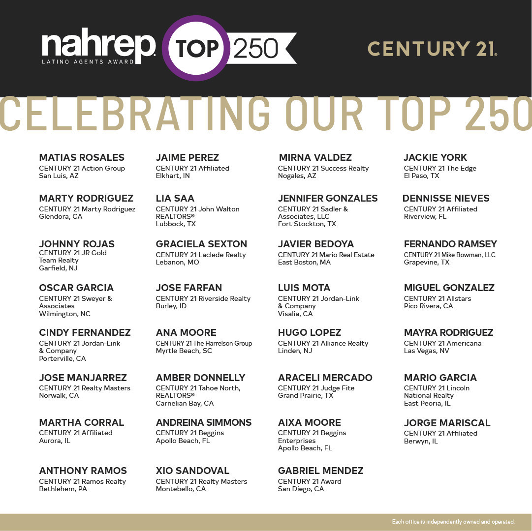 MADISON, New Jersey, May 14, 2020 /PRNewswire-HISPANIC PR WIRE/ — Century 21 Real Estate LLC is proud to announce that 32 of its affiliated relentless sales professionals earned their way onto the National Association of Hispanic Real Estate Professionals (NAHREP) 2020 “Top 250 Latino Agents Report” that recognizes outstanding real estate agents and teams from around the country. The 32 CENTURY 21® System members represent 13% of the honorees on the Top 250 list, the second highest total among all real estate companies, and signifies the brand’s commitment to Hispanic homeownership and entrepreneurship.