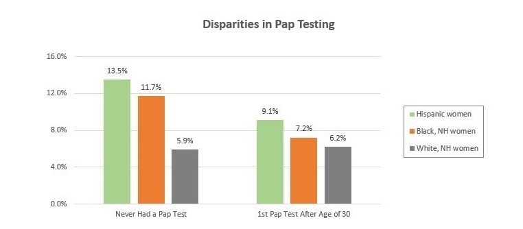 Given the rates of cervical cancer among Hispanic women it is concerning that Hispanic women are less likely than non-Hispanic Black and White women to have a healthcare provider talk to them about a Pap test or HPV. Additionally, non-Hispanic Black women are the least likely to have a healthcare provider talk to them about cervical cancer. Furthermore, among women who have had a Pap test, Hispanic women receive their first Pap test at later ages, with 9.1% of Hispanic women getting their first Pap above the age of 30, compared to 7.2% and 6.2% for non-Hispanic Black and White women, respectively (see figure below).